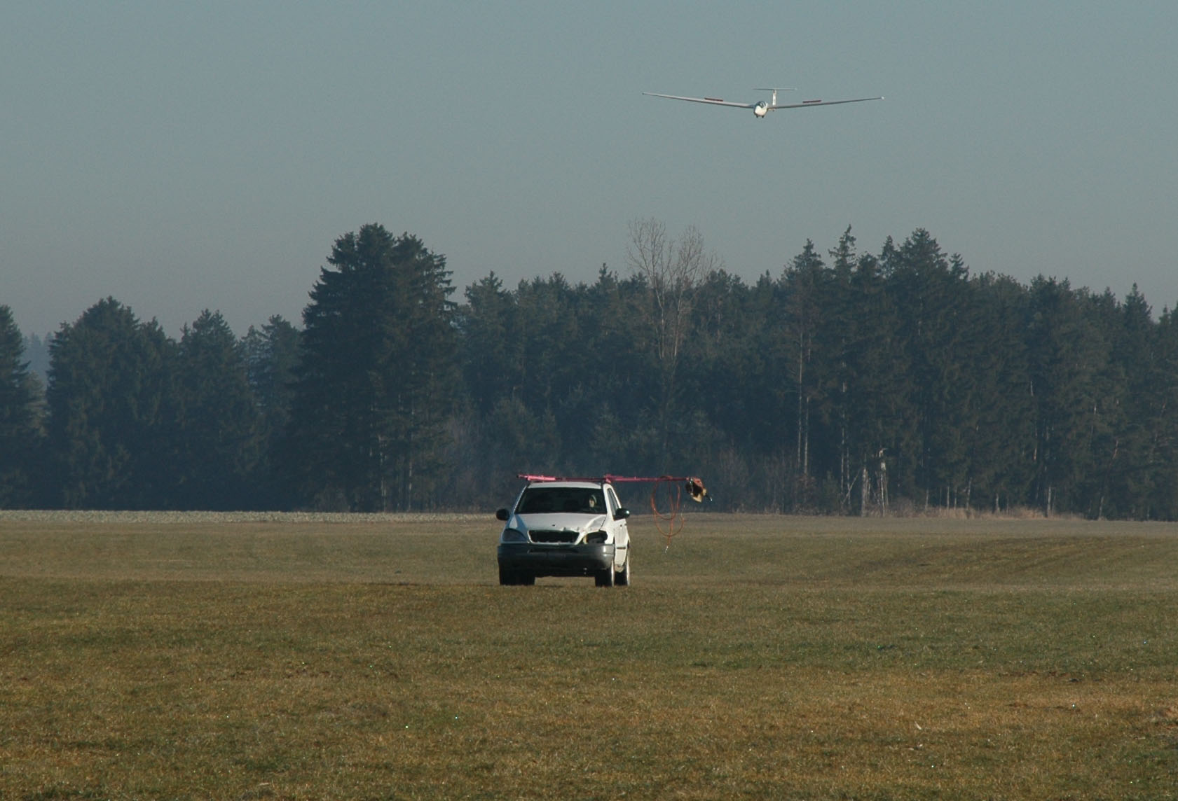 | Die Winde: Unser „Himmelskatapult“, ein Eigenbau des Augsburger Vereins für Segelflug - sieht harmlos aus, ist sie aber nicht. Über 90 % aller Segelflugstarts finden am Geratshof mit der Winde statt, da dies die effizienteste Art ist, um in die Luft zu kommen. Die Schlepphöhen liegen je nach Wetter bei ca. 400 - 500 m über Grund. Die Winde wird durch einen V-10 Zylinder LKW Diesel-Motor von MAN angetrieben. Er hat 320 PS, fast 16 l Hubraum, ein gigantisches Drehmoment von 1050 Nm und ist damit in der Lage, Segelflugzeuge beim Start in 2 Sekunden von 0 auf 100 km/h zu beschleunigen. Pro Windenschlepp liegt der Verbrauch bei ca. 0,5 l Diesel – und das reicht für unsere Piloten, um damit bei gutem Wetter Strecken von über 1000 km zurück zu legen. | ![]() |