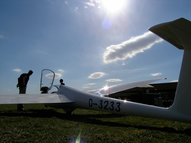 Vor dem Start, noch lächelt sie. Im hinteren Sitz fehlt etwas.... nach der Abschlußt(r)aufe ... sie lächelt immer noch Gut lachen hat auch Angelika Mayr (21), die in Ellighofen lebt und bereits im Spätsommer 2008 ihre ersten Soloflüge gemacht hat. Sie fliegt inzwischen, unter anderem, auf einer Standard Libelle, die ein Vereinsmitglied vorübergehend für erfahrene Flugschüler zur Verfügung gestellt hat. Da der Geratshof zur Zeit sehr erfolg- und vor allem zahlreich ausbildet, werden aktuell die Flugzeuge knapp Angelika vor der bereits wieder im Anhänger verstauten Libelle Die Standard Libelle ist eine bereits 40 Jahre alte Konstruktion, sie ist eines der ersten in Serie gebauten Kunststoff-Segelflugzeuge. Ihr Konstrukteur, der legendäre Eugen Hänle, hat mit ihr aber Maßstäbe bis heute gesetzt. So werden die erstmals bei der Libelle verwendeten Sicherheitskonzepte, z.B. die automatischen Anschlüsse, heute bei allen Segelflugzeugen eingebaut. Man kann mit der Libelle auch noch Weltmeister werden, Jens Becker vom Geratshof hat sich mit seinem Exemplar in die Nationalmannschaft geflogen. ms