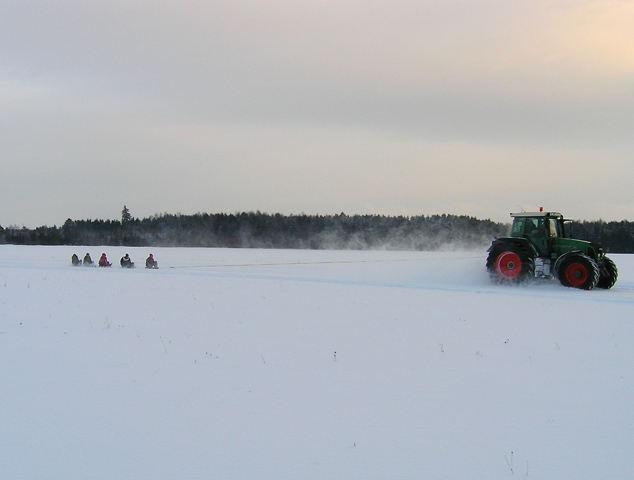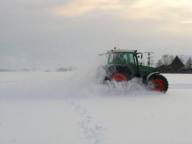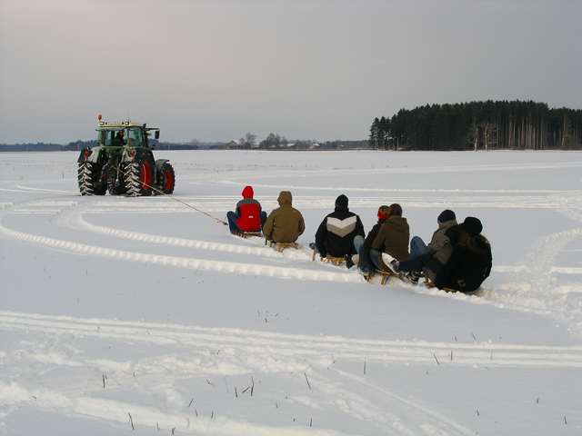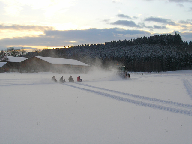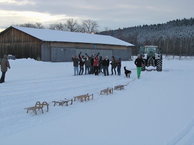 In Schneewehen bis zu 50 cm hoher, herrlicher Pulverschnee türmt sich zur Zeit auf der Start- und Landebahn des Flugplatzes Geratshof. Zuviel, um mit den LSV-Flugzeugen, zumindest ohne Skifahrwerk, starten zu können. Deshalb beschloss das LSV Jugend- und Flugschülerteam nach dem Technikunterricht vergangenen Sonntag gleich in einer Praxiseinheit die erlernten Aerodynamikkenntnisse anzuwenden und die Flugeigenschaften des klassischen Davoser Rodels zu erproben. Der geübte Rodler weiß, dass dies ein durchaus mutiges Unterfangen ist, da der Davoser Rodel ja bekanntermaßen auf Grund seiner starren Holzkonstruktion gerade bei beim Line-Up auf die Piste und bei deren zu schnellem Verlassen zum Ausbrechen neigt. Unklar war auch, wie es sich mit dieser Ausbrechneigung bei engen Kunstflugfiguren und bei Annährung an die Schallgeschwindigkeit verhalten würde. Zur Stabilisierung und damit zur Erhöhung der Sicherheit entschied sich das Flugschülerteam, mindestens 5 Rodel aneinanderzuhängen und diese mit mindestens 7 Piloten zu besetzen. Zum Einsatz kam die mehrere Hundert-PS starke Schleppmaschine vom Typ Fendt 818 mit spezieller Tiefschnee-Eignung. Hier nun die Dokumentation: