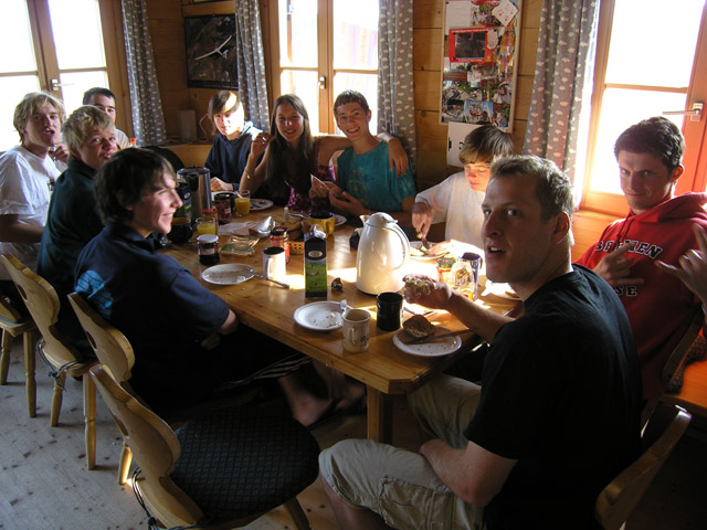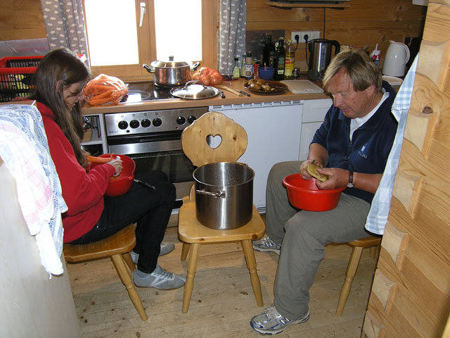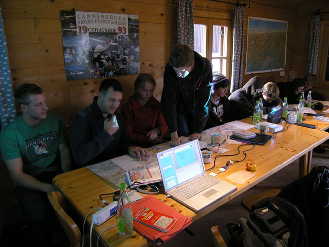 Tag 7 - 11.09.: Gemütlich! Hochnebel und tiefe Wolken sorgten für einen gemütlichen Tagesbeginn mit ausgedehntem Frühstück. Danach wurden erst mal die Hütte und alle Flieger gründlich gesäubert und ausgesaugt. Nebenbei lernten fünf frisch gebackene Windenfahrer per Intensivkurs das Spleißen. Ab Mittag ging's, nachdem die Wolkenuntergrenze hoch genug war, bis Abends mit konzentrierten Schulstarts weiter. Nach der letzten Landung mit improvisierter Landebefeuerung gab's bei gemütlich brodelndem Hüttenofen Reinholds Spezial-Gemüse-Eintopf. je