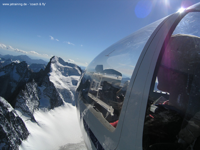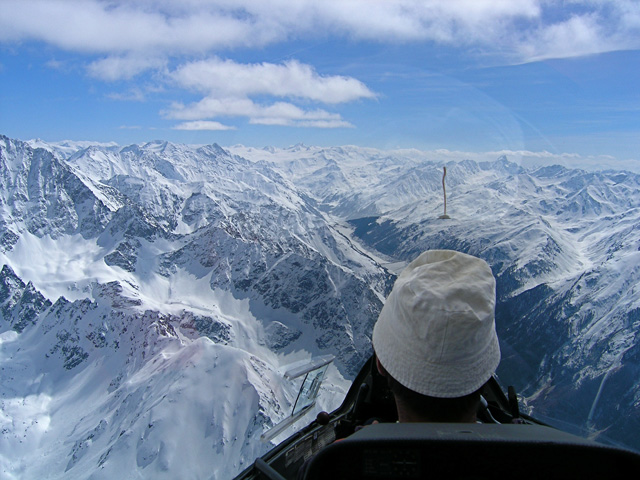 Nach dem Windenstart am Geratshof erklimmen wir die erste Höhe im thermischen Aufwind im Flugplatzbereich. Angetrieben durch weitere Aufwinde und dazwischen liegende Gleitstrecken führt der erste Flugabschnitt über die herrlich grüne Hügellandschaft und die Seen des Alpenvorlandes. Westlich von Füssen geht’s dann vorbei am Aggenstein ins Thannheimer Tal, dort im Gleitflug entlang der von der Vormittagssonne schon kräftig angewärmten Nordhänge. Mit einer Mischung aus Thermik und Hangaufwind geht der Flug weiter: zunächst ein Stück das Lechtal aufwärts, dann erfolgt der Sprung ins Inntal bei Imst. Es geht weiter den Inn aufwärts, unter den vom Wind sanft rauschenden Flügeln ziehen Landeck und das Engadin vorbei, rechter Hand das gewaltige Silvrettamassiv mit dem Piz Buin. Kurz hinter St. Moritz ist mit dem über 4000 Meter hohen Piz Bernina und seinem beeindruckenden Bianco Grad einer der Höhe- und Wendepunkte des Fluges erreicht. Von nun an geht es ostwärts: über den Schweizer Nationalpark, das Münstertal mit Ofenpass ins Etschtal nach Südtirol. Über dem Vinschgau folgt ein Blickerlebnis dem nächsten: links die Stubaier Alpen, rechts das Ortlermassiv. Vorbei an Meran tragen die Aufwinde unseren Flug in die traumhaften Dolomiten: Langkofel, Sellagruppe und Marmolada kommen in Sicht, bevor’s zu den Drei Zinnen und dann entlang des Pustertals bis zum nächsten Wendepunkt bei Lienz geht. Über die gewaltigen hohen Tauern, vorbei am Großglockner geht der Sprung ins Pinzgau und von dort aus 4000 Metern Höhe nordwestwärts, mehr oder weniger im Gleitflug schon Richtung Heimat: Hochkönig und Karwendelgebirge ziehen vorbei und wir genießen das ruhige Ausgleiten über das Alpenvorland, links Walchen- und Kochelsee, rechts Starnberger und Ammersee. Nach sechseinhalb Stunden Flug und fast 800 lautlosen Kilometern über unbeschreibliche Landschaften setzen wir in der Abendsonne zufrieden wieder am Geratshof zur Landung an.